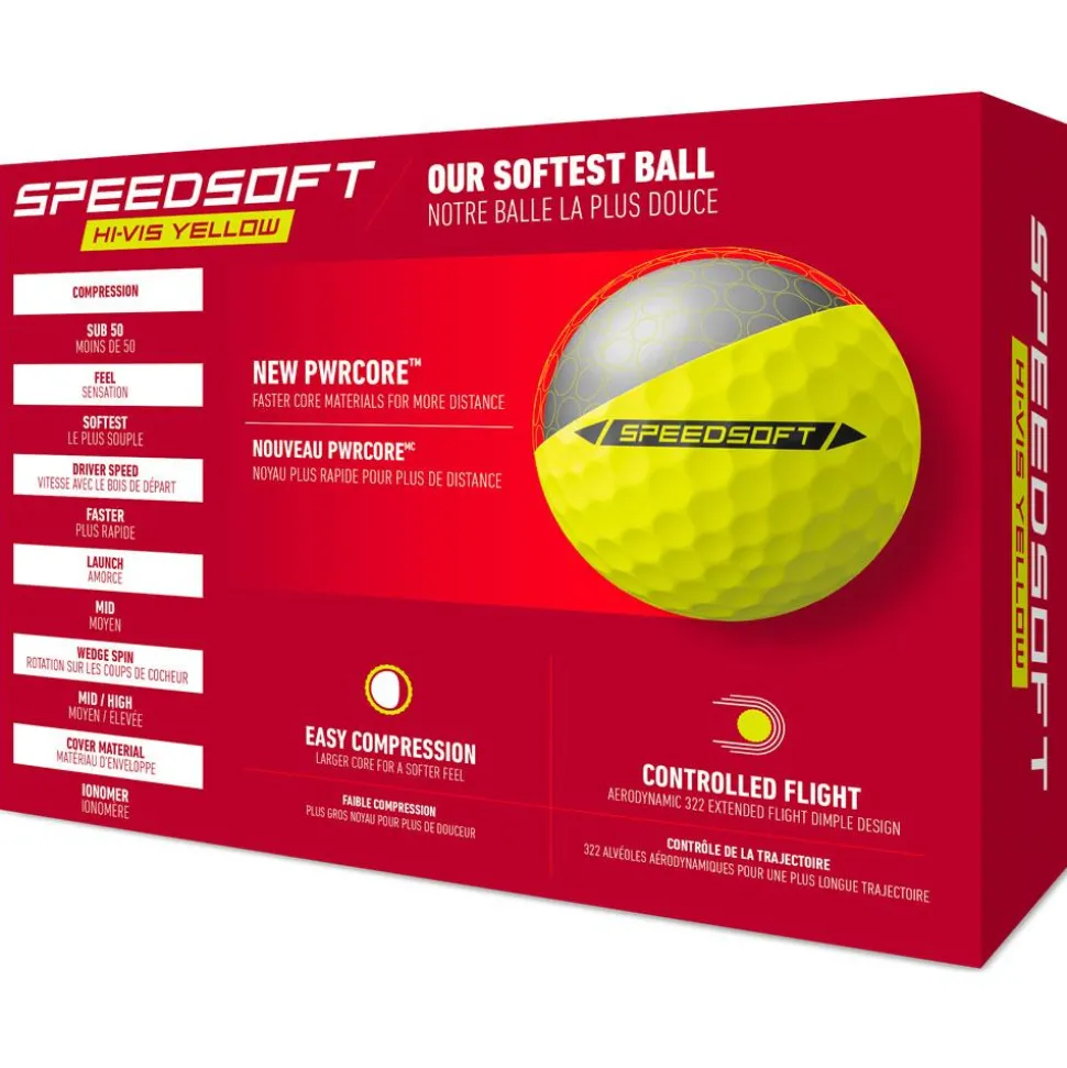 La balle de golf Taylormade SpeedSoft est un modèle 2 pièces avec noyau Pwrcore et alvéoles Extended Flight Dimple Pattern. Le noyau plus volumineux avec un taux de compression plus faible favorise un temps de contact avec la face de club supérieur, limitant le spin et augmentant la distance. Ces balles de golf offrent un toucher doux, une vitesse élevée, et un angle de lancement intermédiaire. Elles favorisent une distance maximale avec les fers, ainsi qu’un spin intermédiaire/élevé avec les wedges.