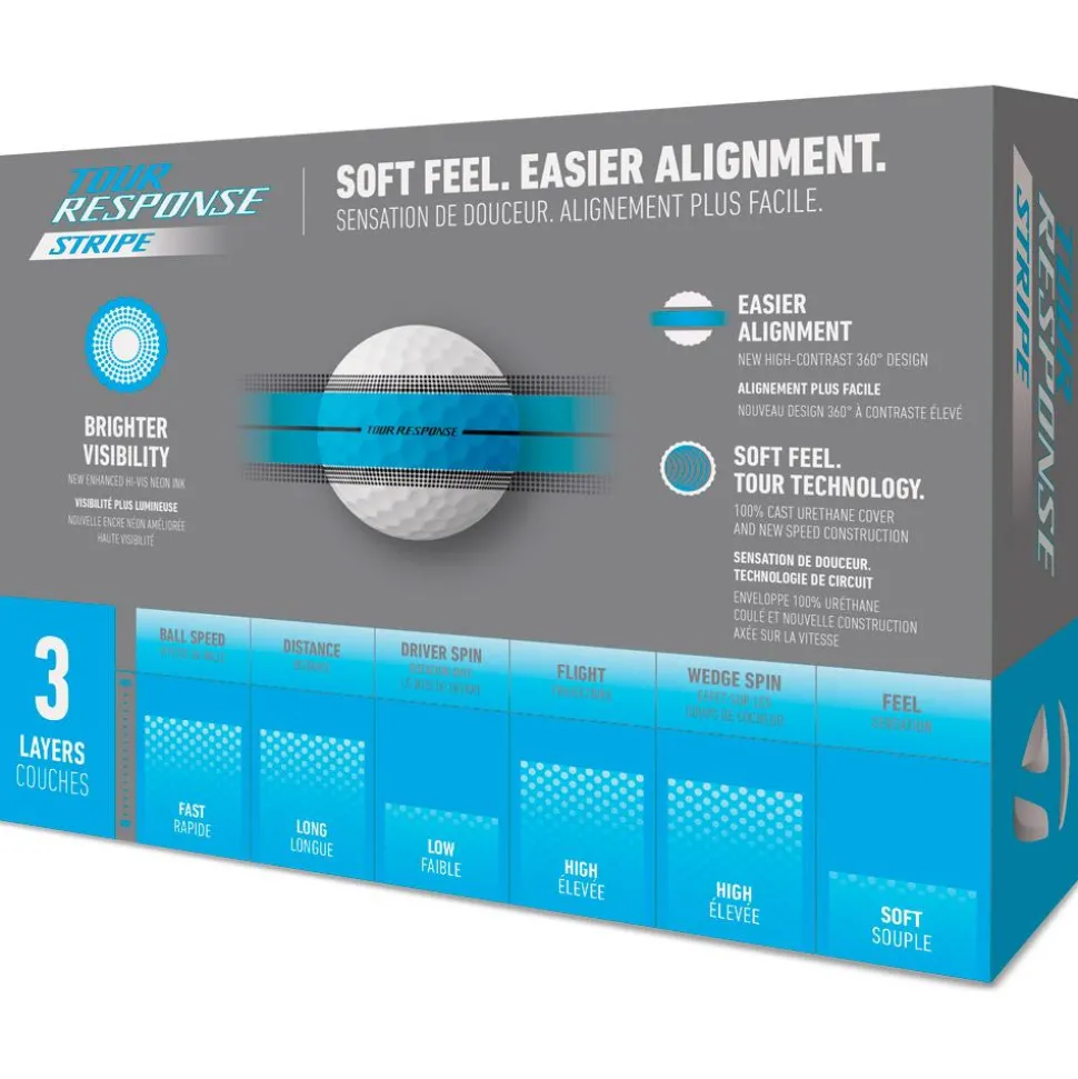 Les balles de golf Taylormade Tour Response Stripe sont conçues avec une attention méticuleuse aux détails, dotées d’une structure à 3 couches qui maximise la performance. Elles disposent d’un noyau Speed Wrapped Core qui maximise le transfert d’énergie à l’impact, permettant ainsi d’accroître les distances parcourues, pour un jeu plus satisfaisant. Le revêtement en uréthane de ces balles favorise une meilleure interaction avec les wedges, offrant un contrôle de précision et un spin amélioré. Leur bande d’alignement à 360° assure une visée plus précise pour des trajectoires améliorées.