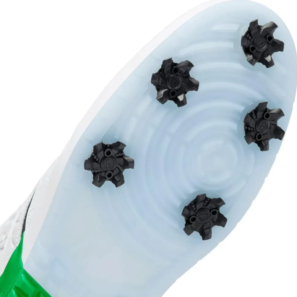 La chaussure de golf Nike Jordan NU Retro 1 G revisite une silhouette emblématique avec des performances adaptées au parcours. Son empeigne en cuir et en matière synthétique apporte structure et durabilité tout en conservant un look intemporel. Conçue pour assurer une stabilité optimale, elle intègre un talon en caoutchouc combiné à une plaque rigide à l’avant-pied, offrant un excellent soutien lors des swings. L’amorti est renforcé par une unité Air située sous le talon, qui absorbe efficacement les impacts pour un confort prolongé sur le green. La semelle extérieure intègre 7 crampons amovibles et une traction secondaire inspirée de l’AJ1 d’origine, garantissant une accroche fiable sur différents types de terrain. Un rembourrage supplémentaire au niveau du col et de la languette améliore l’ajustement et le maintien du pied. Associant protection et confort, cette chaussure assure des performances optimales tout en conservant l’ADN Jordan sur le parcours.