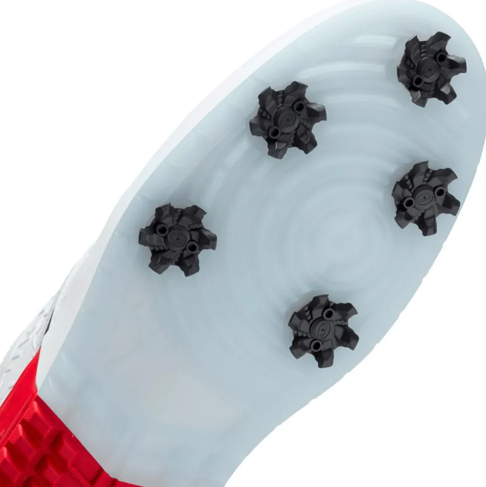 La chaussure de golf Nike Jordan NU Retro 1 G revisite une silhouette emblématique avec des performances adaptées au parcours. Son empeigne en cuir et en matière synthétique apporte structure et durabilité tout en conservant un look intemporel. Conçue pour assurer une stabilité optimale, elle intègre un talon en caoutchouc combiné à une plaque rigide à l’avant-pied, offrant un excellent soutien lors des swings. L’amorti est renforcé par une unité Air située sous le talon, qui absorbe efficacement les impacts pour un confort prolongé sur le green. La semelle extérieure intègre 7 crampons amovibles et une traction secondaire inspirée de l’AJ1 d’origine, garantissant une accroche fiable sur différents types de terrain. Un rembourrage supplémentaire au niveau du col et de la languette améliore l’ajustement et le maintien du pied. Associant protection et confort, cette chaussure assure des performances optimales tout en conservant l’ADN Jordan sur le parcours.