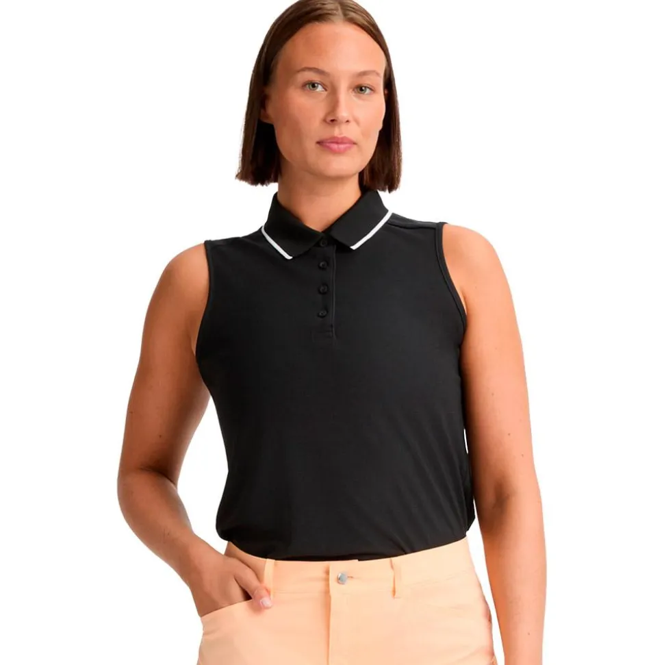 Le polo de golf sans manches Miriam Sleeveless Black de Röhnisch est parfait pour l’été grâce à sa matière stretch en polyester recyclé qui sèche rapidement et évacue efficacement la transpiration.