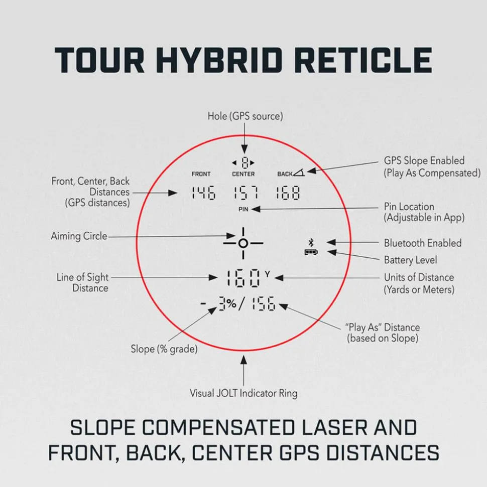 Le Tour Hybrid est un télémètre de golf haut de gamme combinant technologie laser et GPS. Il s’agit du premier appareil de chez Bushnell à proposer à la fois des distances laser compensées en pente (fonction Slope-Switch) et des distances GPS front/centre/back, également ajustées selon la pente, le tout affiché directement dans le même viseur. Vous disposez ainsi en un coup d’œil des distances classiques et celles corrigées pour la pente, sans avoir besoin d’un smartphone ou d’une connexion réseau. Notez que le dispositif Slope-Switch se désactive très facilement afin de se conformer aux règles en vigueur lors des compétitions.