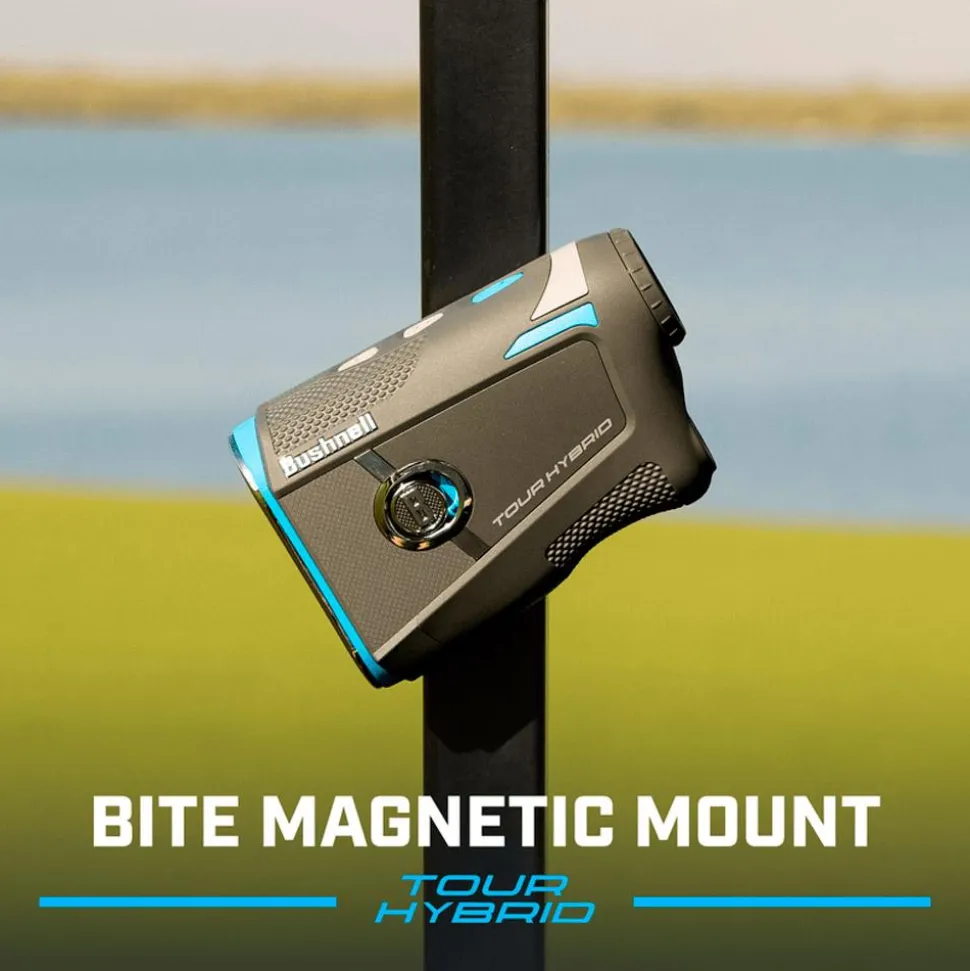 Le Tour Hybrid bénéficie aussi du système PinSeeker avec Visual JOLT. Pour confirmer le verrouillage du drapeau, l’appareil émet une vibration et un rond rouge clignote dans le viseur. Grâce à son aimant intégré, le Tour Hybrid se fixe solidement sur le tube d’un chariot de golf ou sur l’un des montants de votre voiturette, ce qui permet de le garder toujours à portée de main.