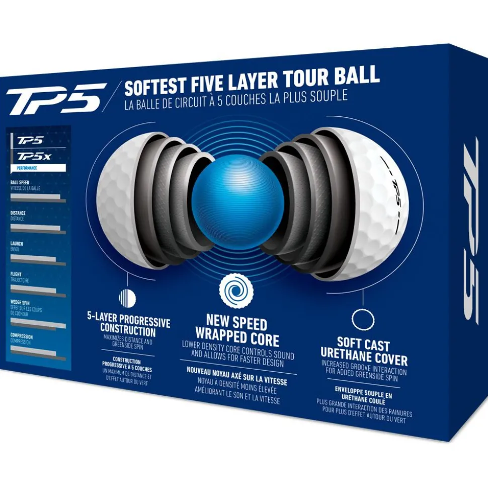 La balle de golf Taylormade TP5 offre des caractéristiques innovantes pour une expérience de jeu améliorée. Le nouveau Speed Wrapped Core est conçu pour produire un son plus doux, enrichissant les sensations du joueur grâce à une fréquence sonore améliorée.