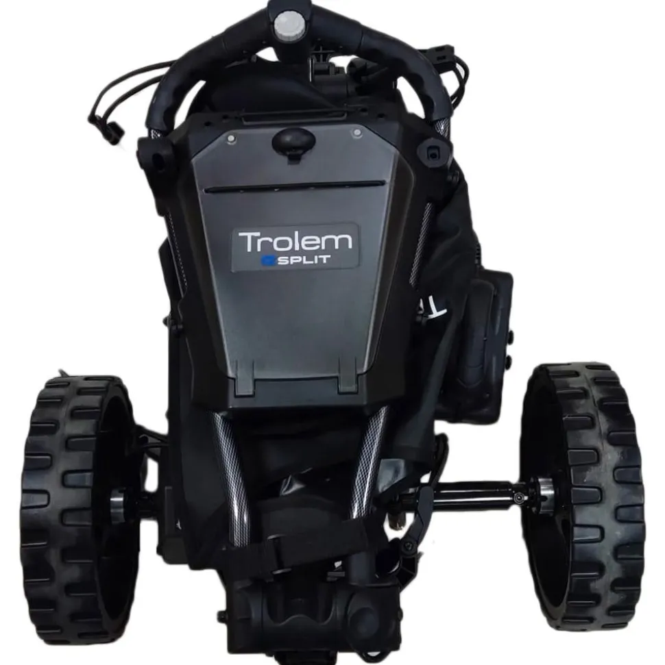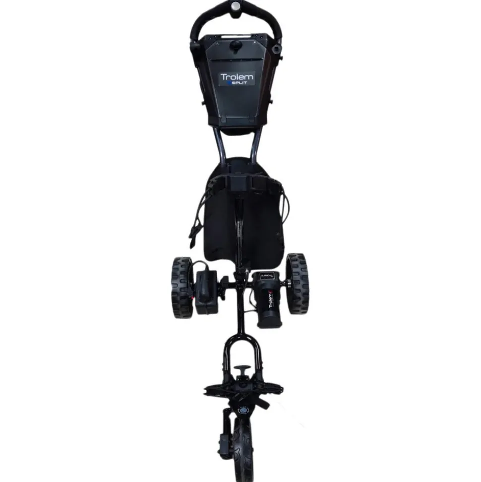 Le chariot électrique Trolem eSplit Brake Carbon Design offre praticité avec son frein électronique, rangement compact et accessoires intégrés, idéal pour des parcours de golf fluides et organisés.