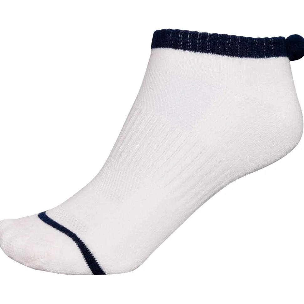 Les chaussettes Footjoy Women Prodry Pom Pom White Navy offrent confort et fraîcheur aux golfeuses, avec technologie DrySof, amorti et maintien optimal, le tout avec un pompon élégant.
