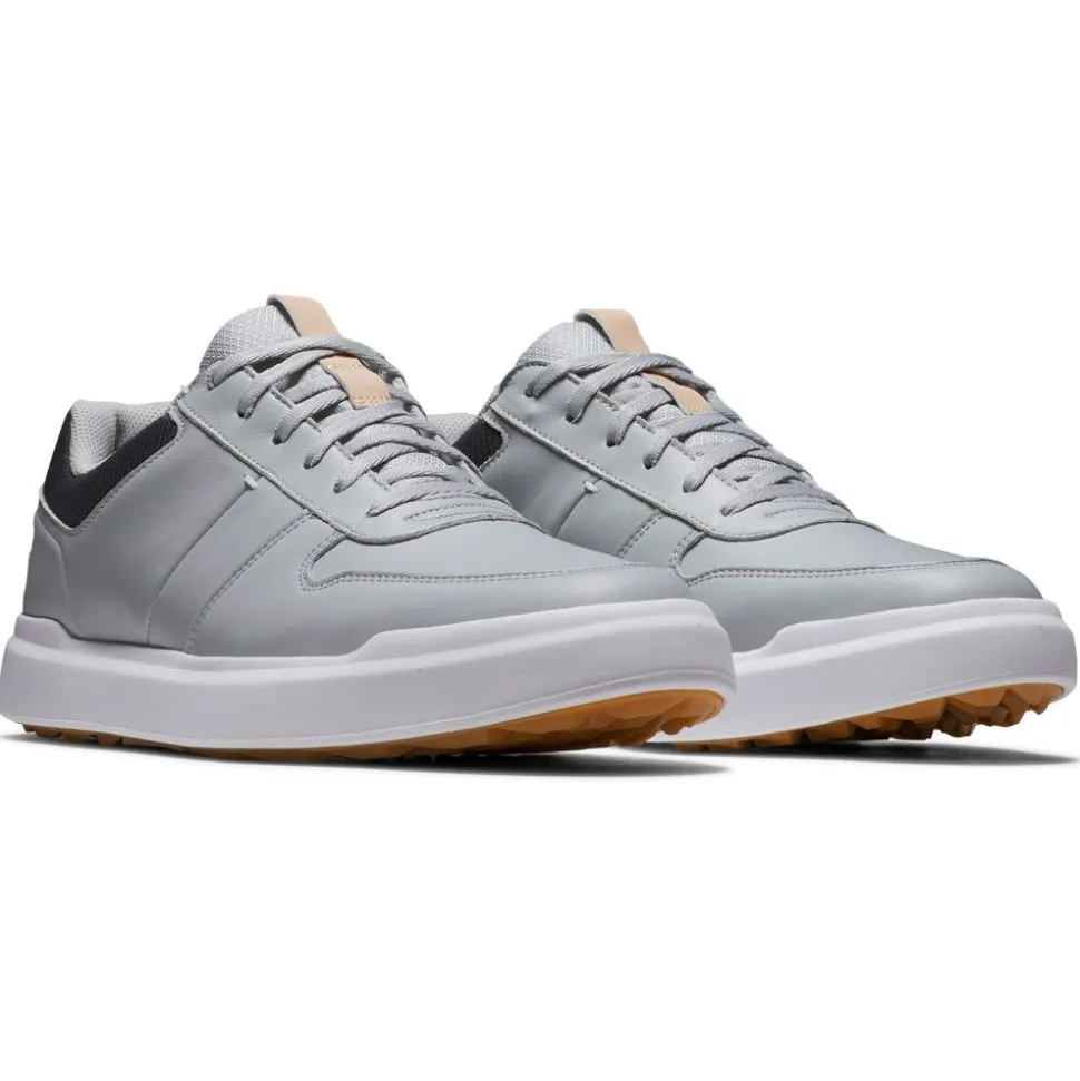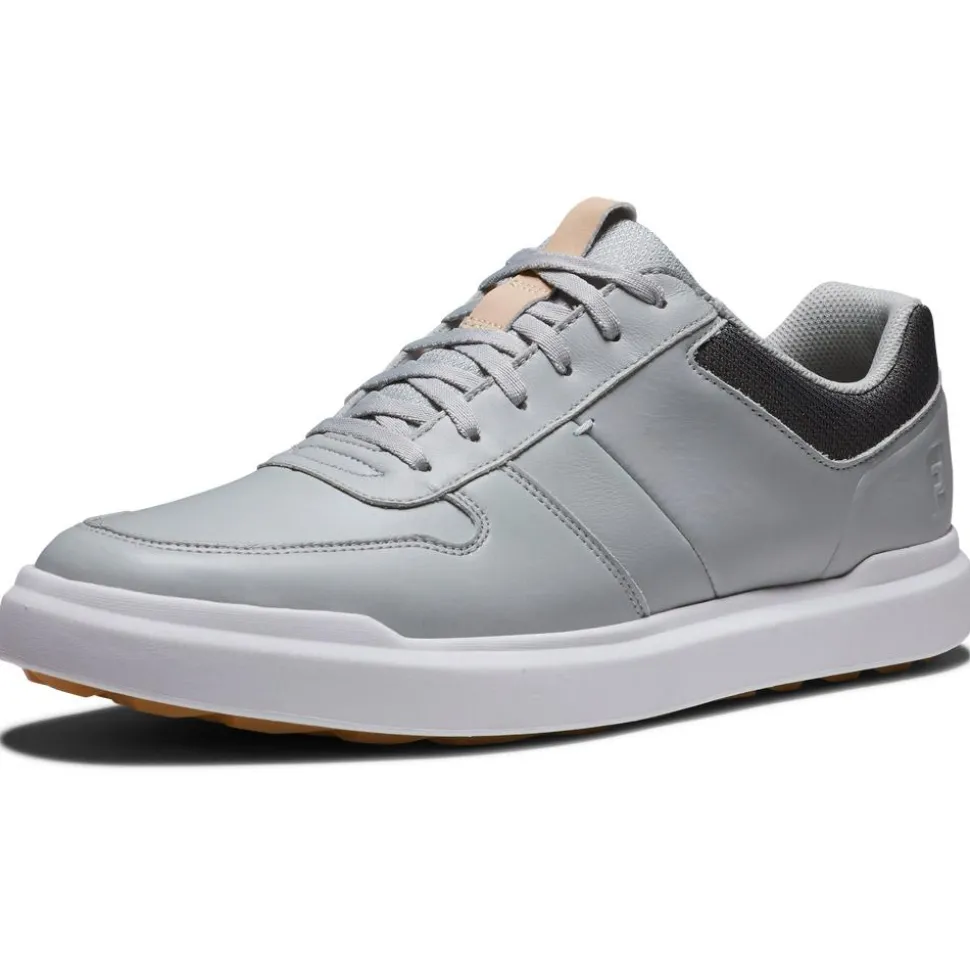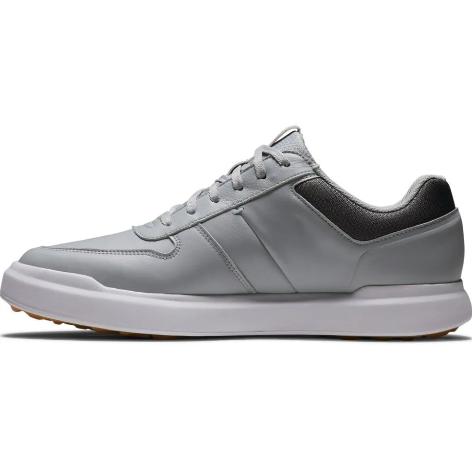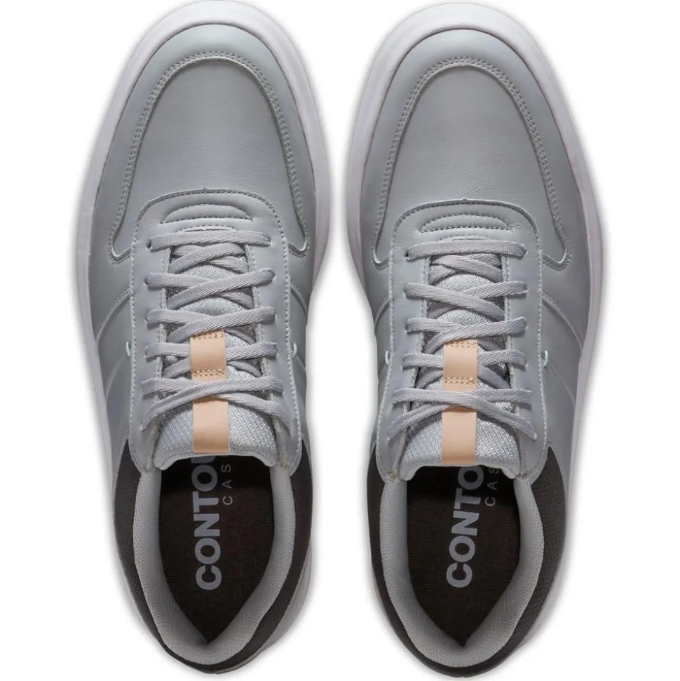 La chaussure de golf Footjoy Contour Casual Grey Grey White allie style classique et confort durable, grâce à sa tige en cuir, sa semelle VersaTrax et son FitBed souple pour un jeu optimal.