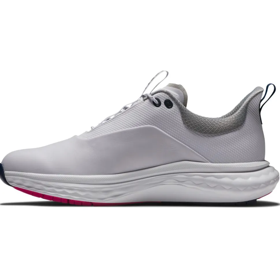 La chaussure de golf sans spikes Footjoy Quantum White Blue Pink, avec sa technologie SofFOAM, offre un amorti supérieur pour un confort longue durée, parfait pour des journées entières sur le parcours.