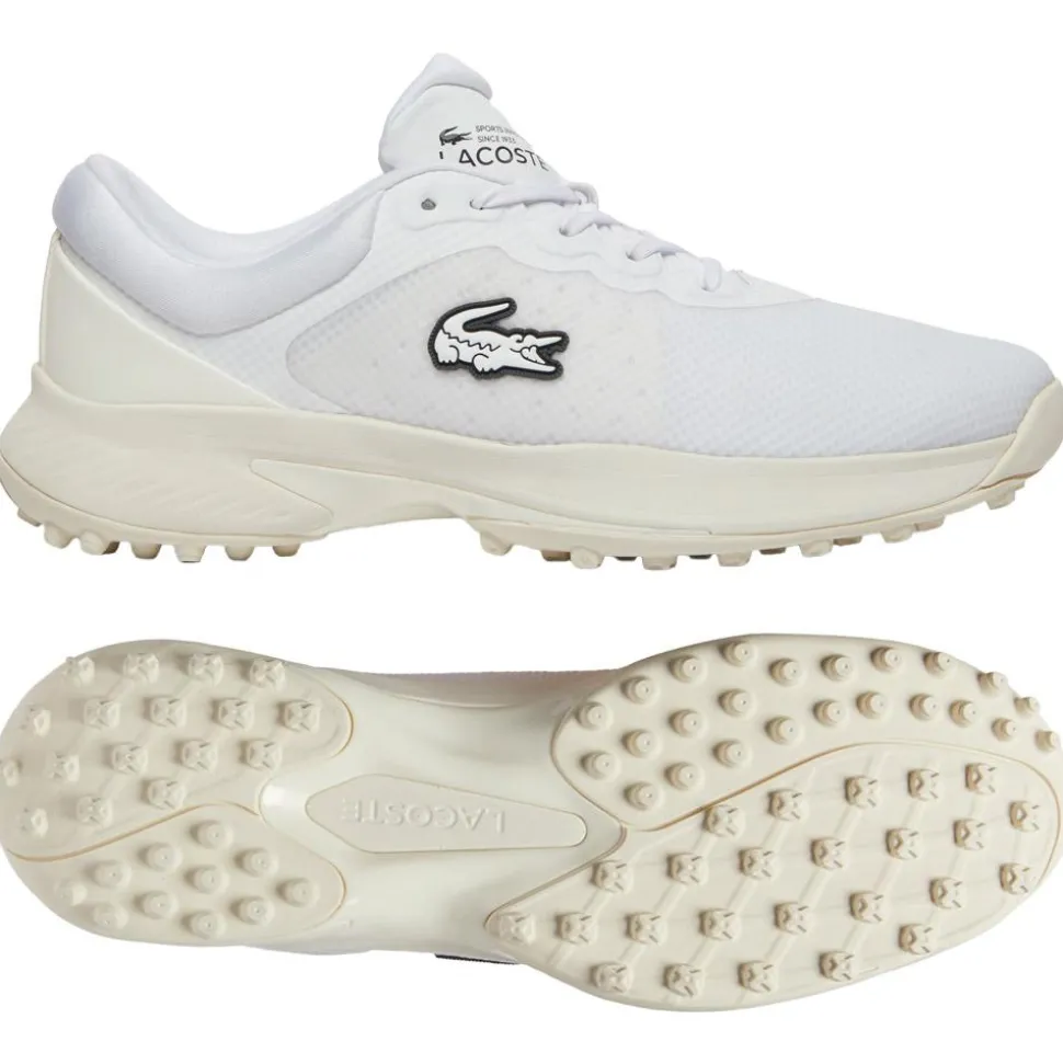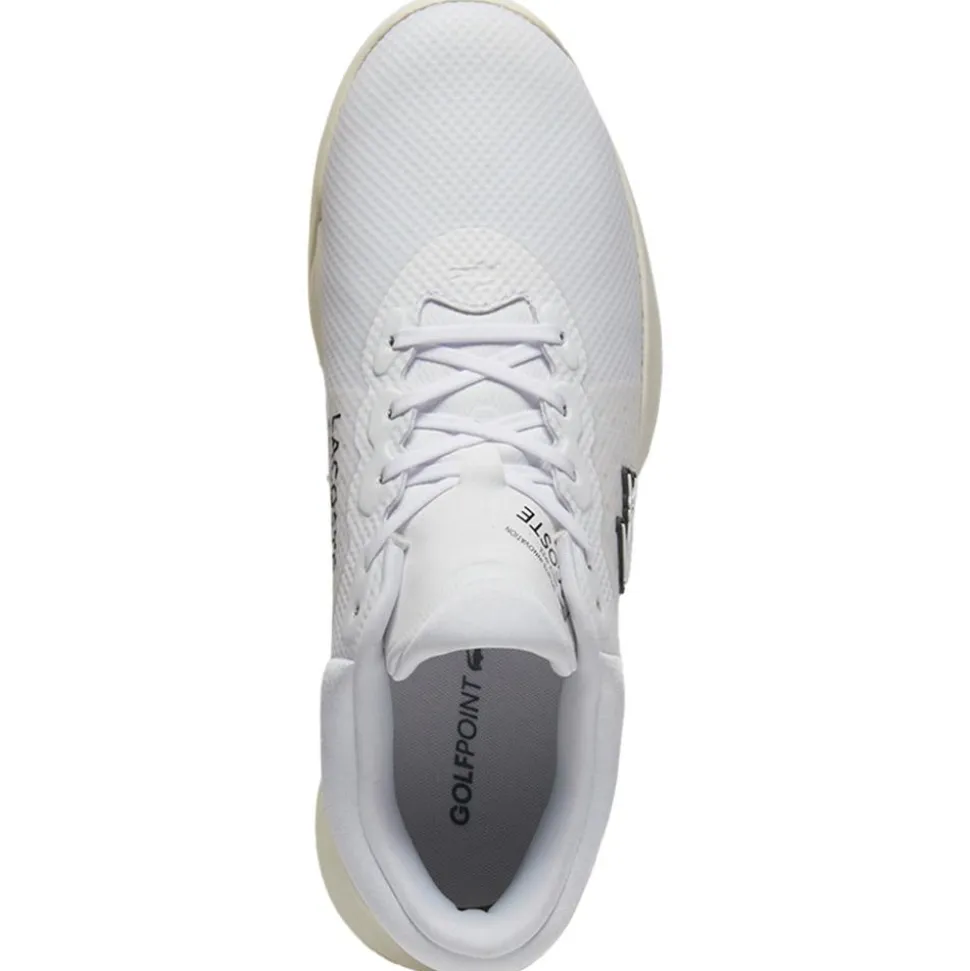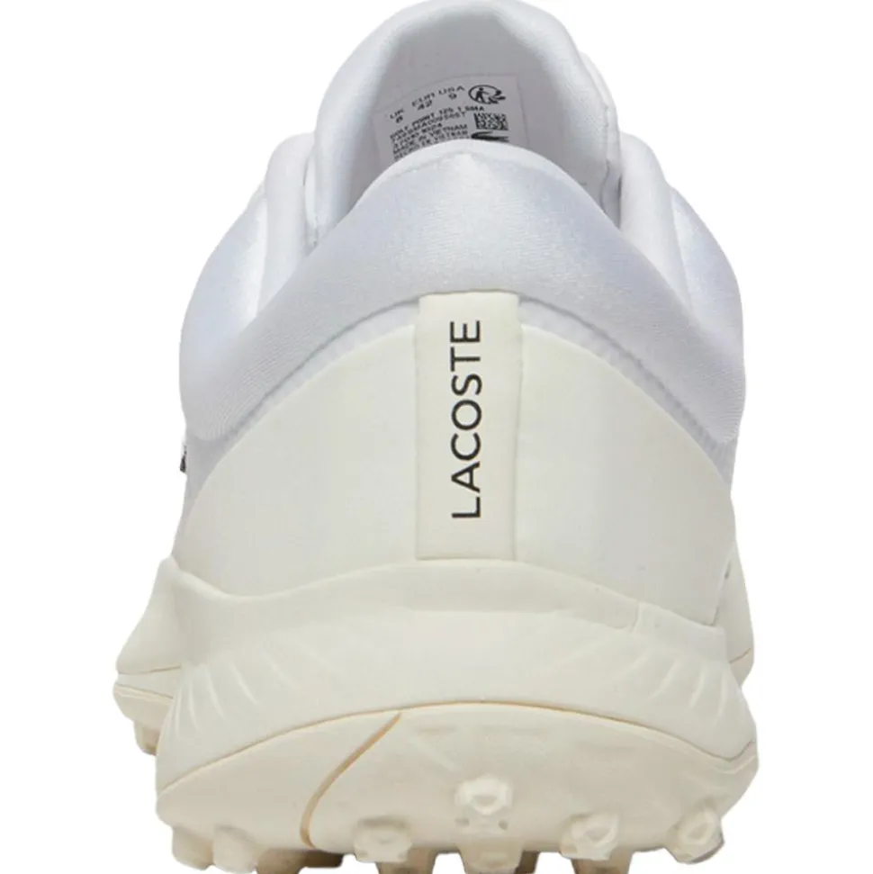 La chaussure de golf Lacoste Golf Point White Off White allie élégance et fonctionnalité avec une tige déperlante, un confort rembourré et une semelle adhérente pour une performance optimale sur le green.
