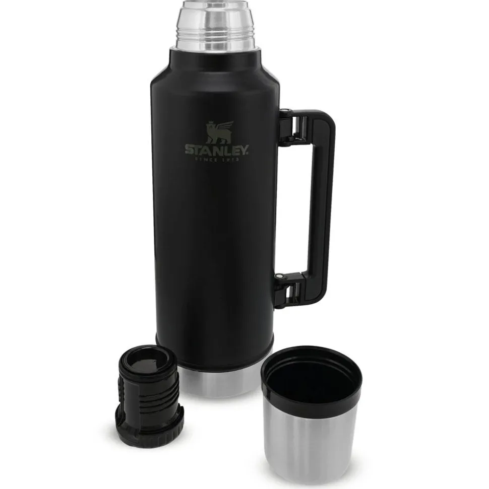 La gourde Stanley The Legendary Classic Bottle 1.9L Matte Black Pebble, en acier inoxydable et isolation sous vide, garde les boissons chaudes ou froides pendant de nombreuses heures.