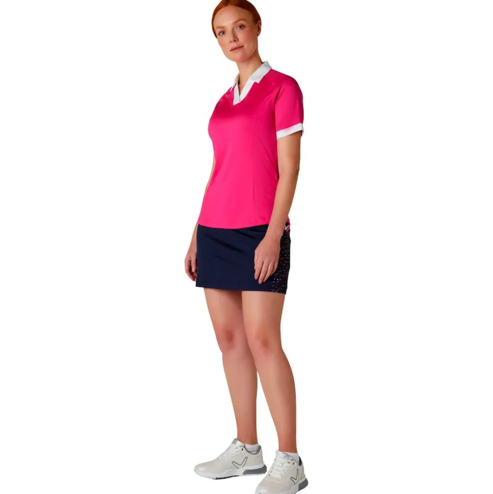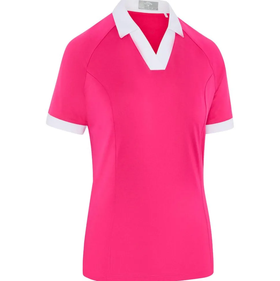 Le polo de golf pour femme Callaway V-Placket Colorblock Pink Peacock allie style moderne et confort avec Swing Tech et Opti-Dri pour une performance optimale au golf.