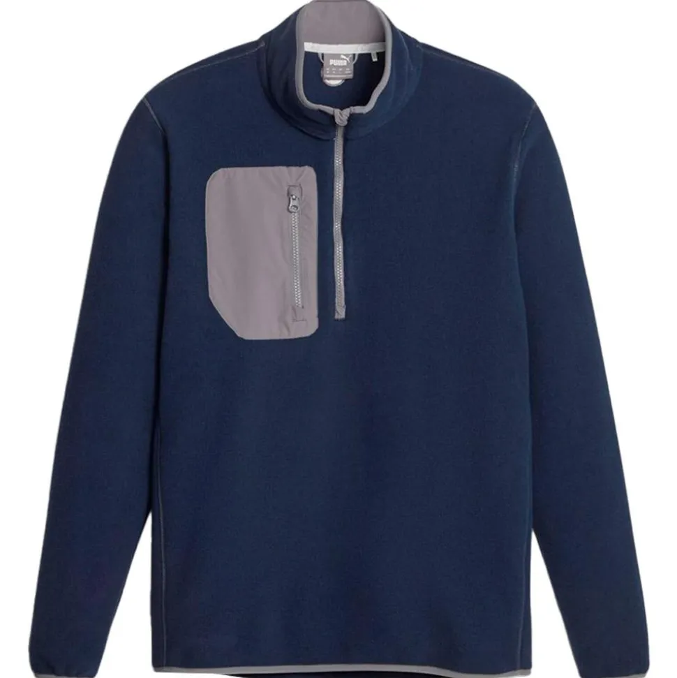 Le pull Fleece 1/4 Zip Navy Blazer Slate Sky de Puma est un vêtement de golf en polaire 100% polyester, confortable, élégant et pratique avec une poche poitrine zippée pratique.