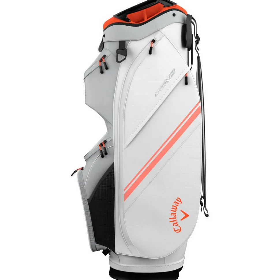 Le sac chariot Callaway Chase 14 Cart White Silver Orange est un accessoire de golf léger et robuste, pesant seulement 2,4 kg, avec 14 compartiments et 8 poches pour une organisation optimale sur les parcours.