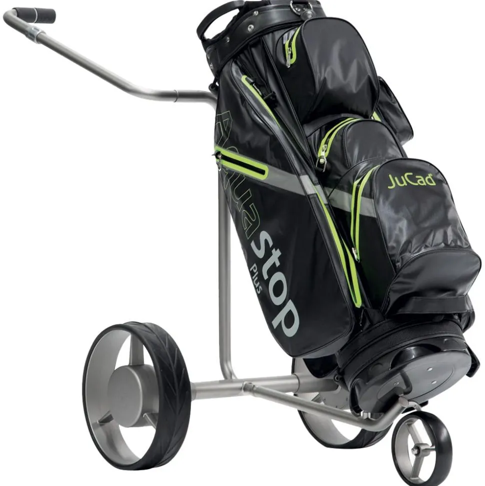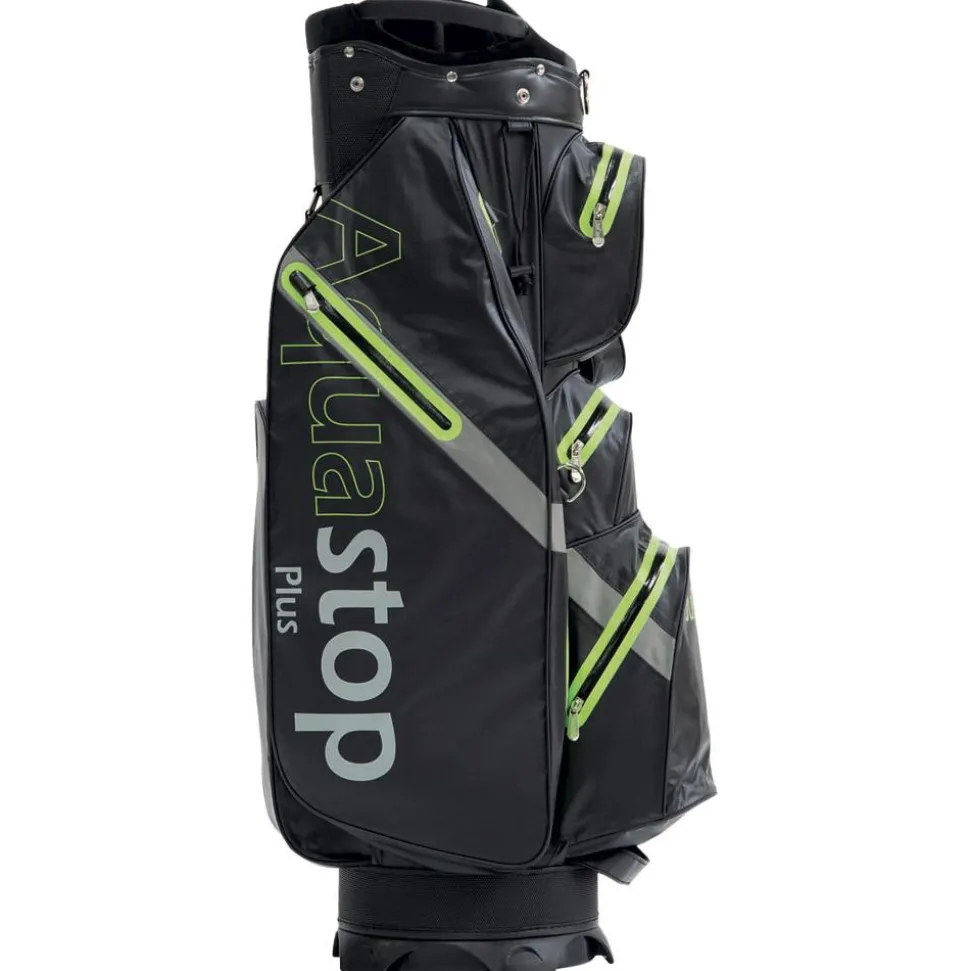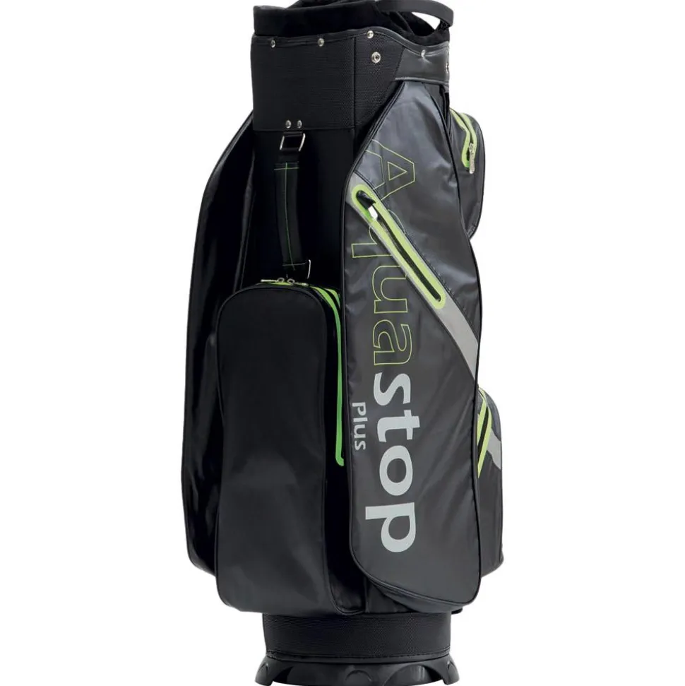 Le sac chariot de golf JuCad Aquastop Plus Noir Vert, en nylon imperméable, propose 14 compartiments, un porte-putter, des poches spacieuses et une poche isotherme, pour une expérience de golf optimale.