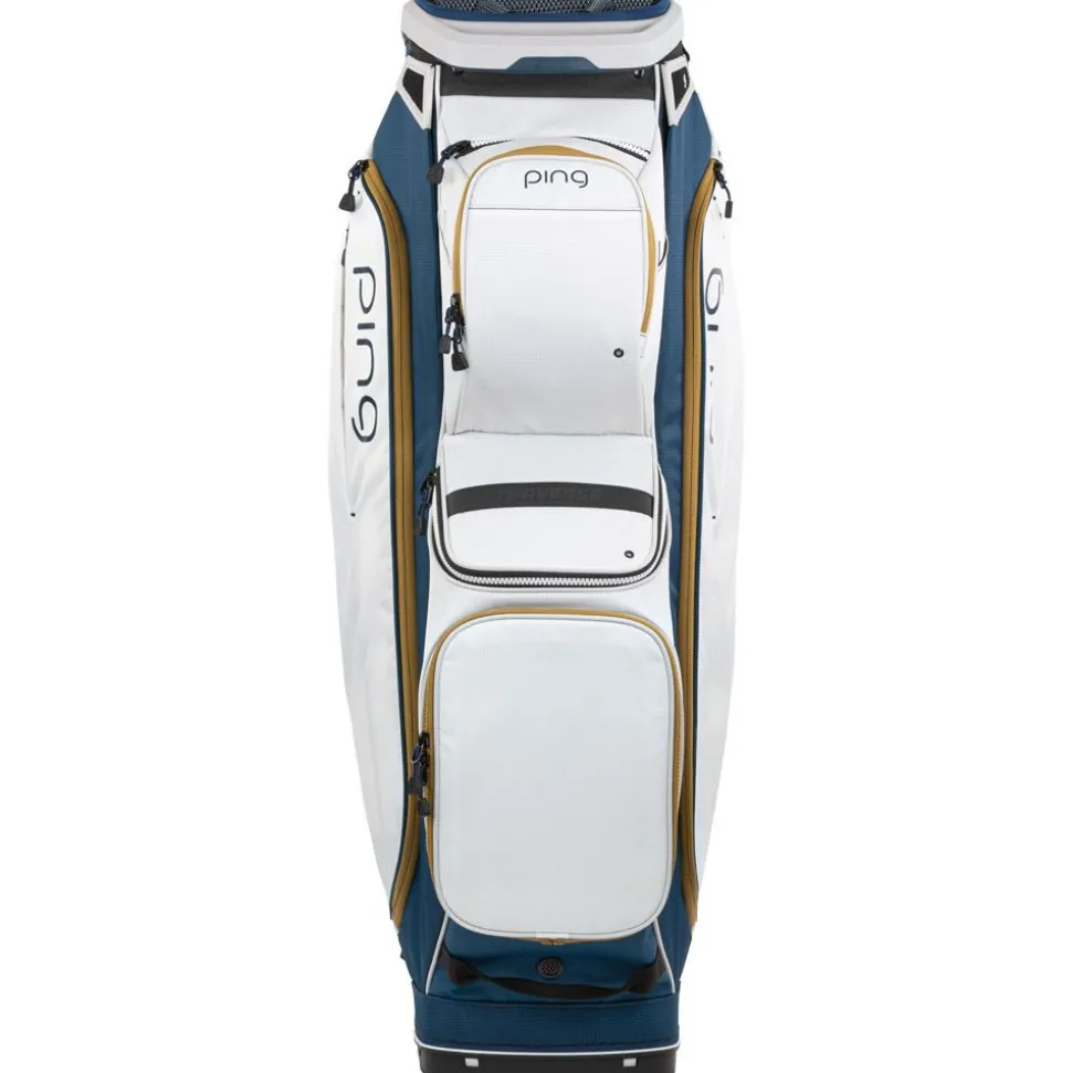 Le sac chariot Ping Traverse 244 Navy Platinum Gold est un modèle spacieux et pratique, offrant une excellente organisation pour vos clubs et accessoires, tout en étant résistant aux intempéries grâce à son traitement déperlant.