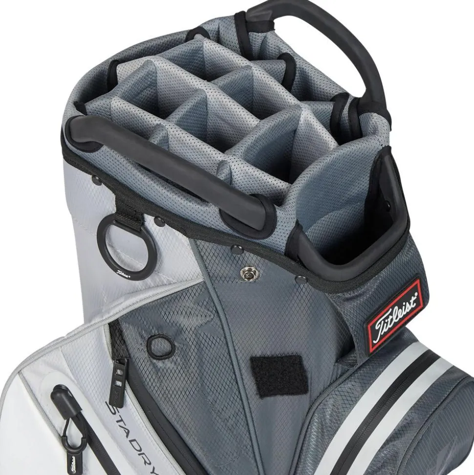 Le modèle Titleist Cart 14 Stadry est un sac de golf imperméable qui permet d’emporter équipement et accessoires sur le terrain en les protégeant de la pluie. Il intègre 14 compartiments pour les clubs avec un puits séparé pour le putter et des diviseurs pleines longueur pour ne pas que les shafts s’emmêlent. De multiples poches de rangement sont prévues pour organiser balles, tees et vêtements de rechange, dont une poche isotherme qui permet de garder une boisson fraîche. Ce modèle intègre également une poignée pour faciliter sa manipulation et dispose d’une sangle pour le porter.