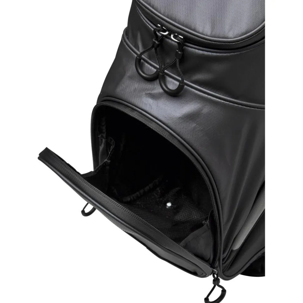 Ce sac propose 9 poches bien agencées, incluant 2 grandes poches vêtements, une poche isotherme spacieuse, 2 poches dissimulées pour vos objets de valeur et une poche aimantée pour le télémètre. Modèle haut de gamme, il possède aussi un support de parapluie, un porte-serviette et un capuchon de pluie permettant d’affronter la pluie si une grosse averse survient.