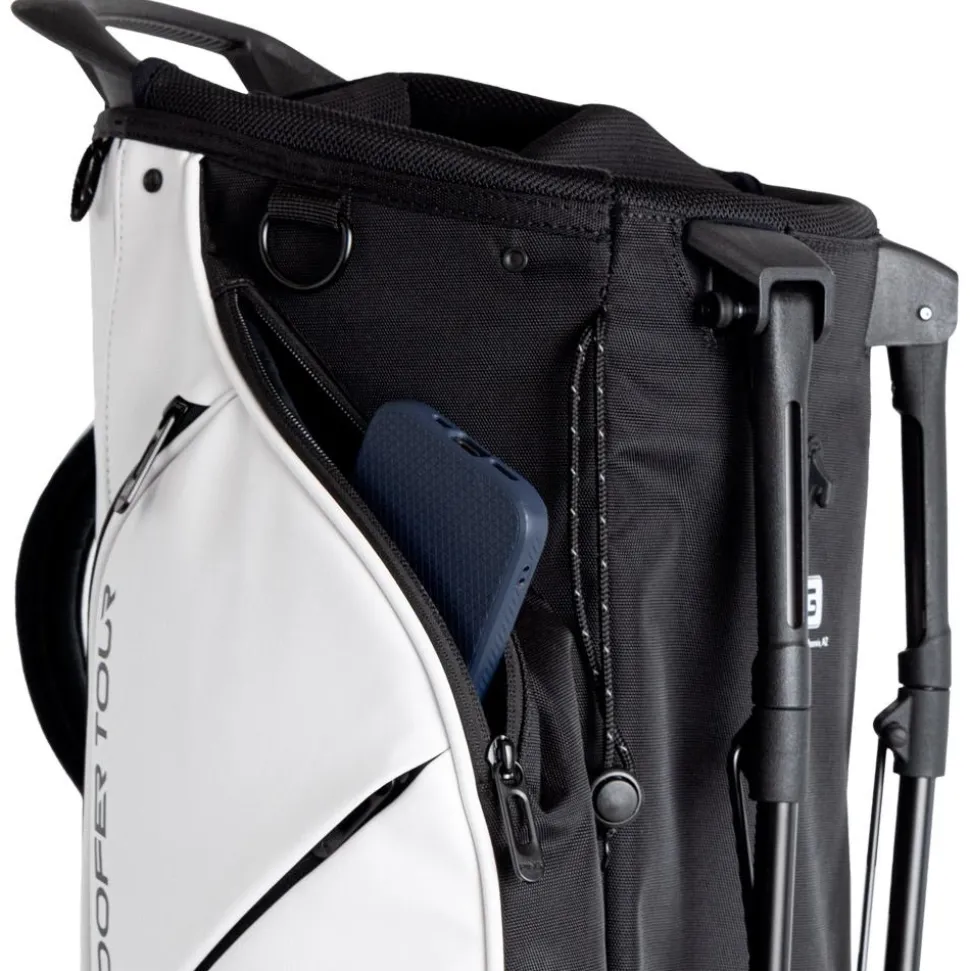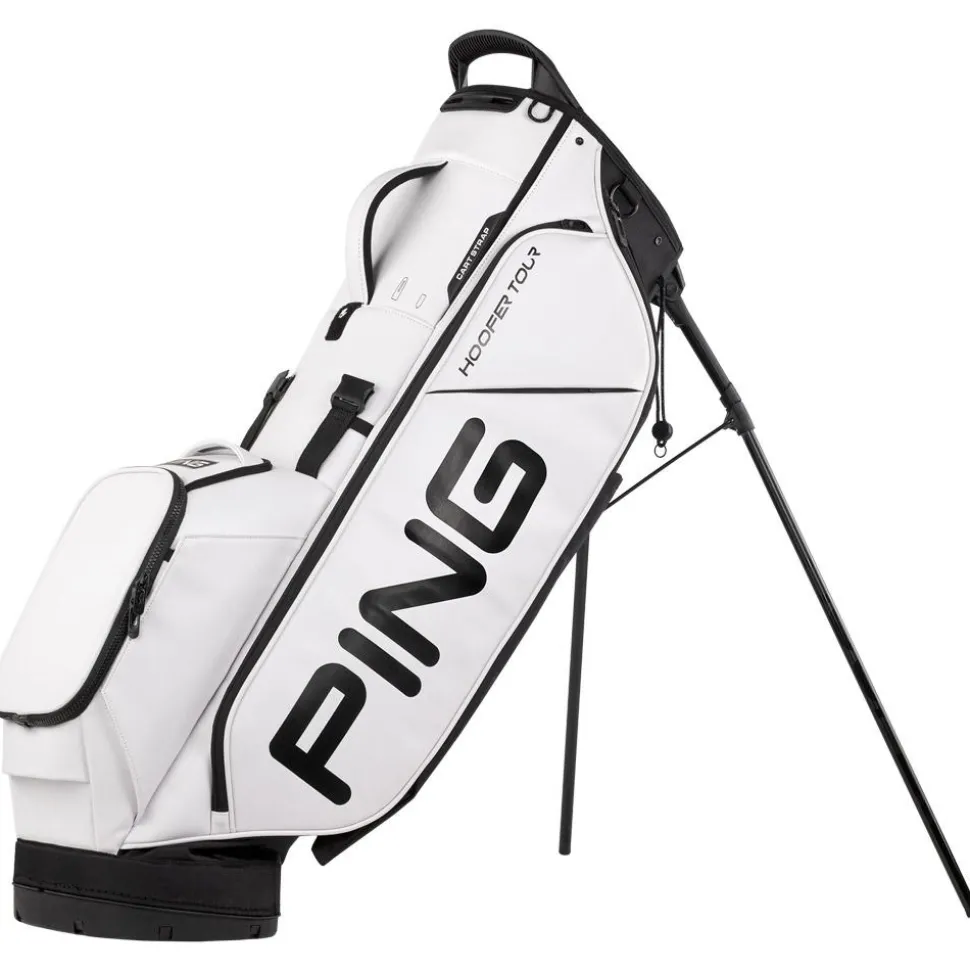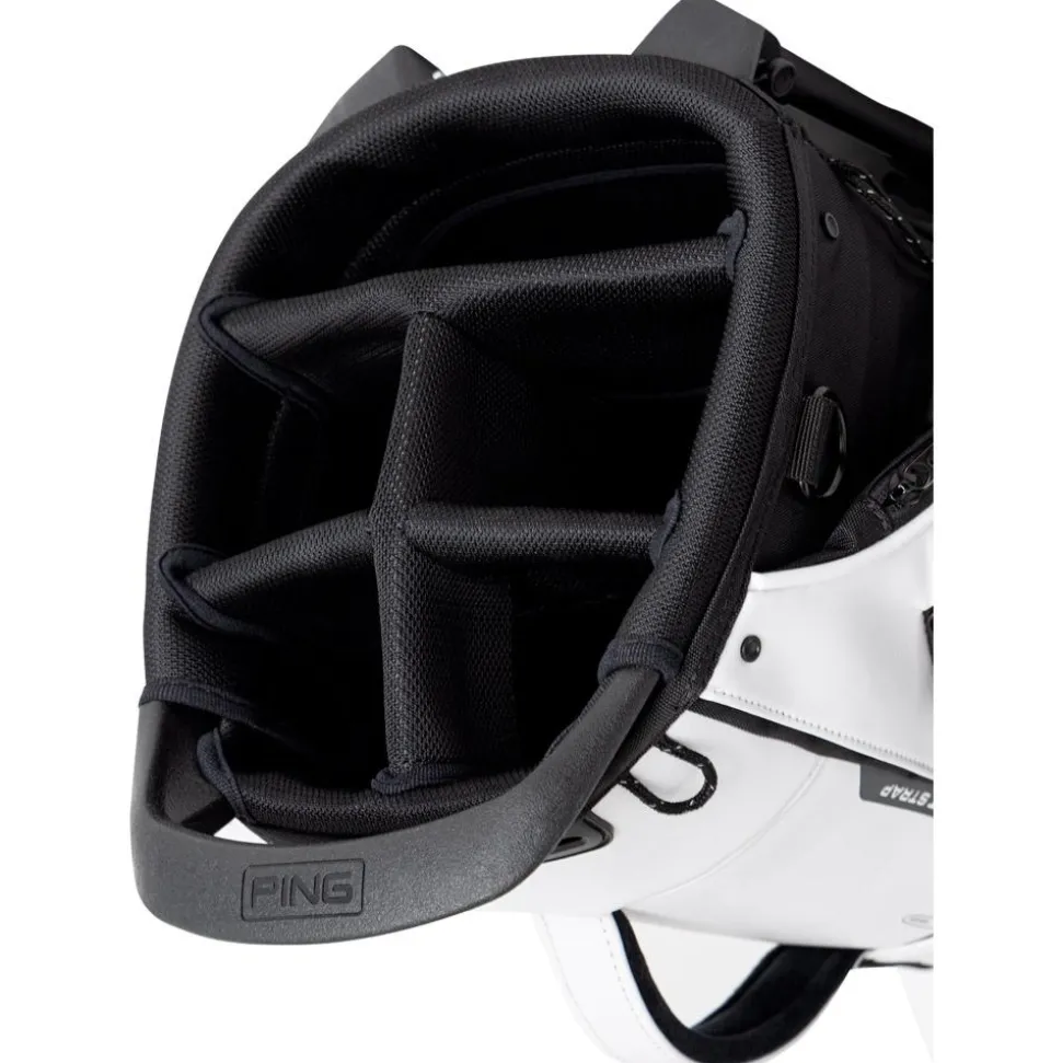 Le sac trépied Ping Hoofer Tour 244 White Black allie organisation optimale avec ses 5 compartiments et 9 poches, et confort grâce à ses bretelles ergonomiques, idéal pour un transport aisé sur les parcours.