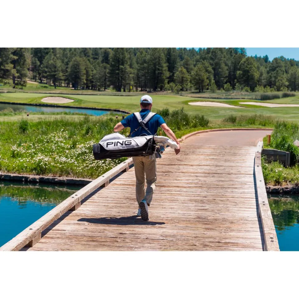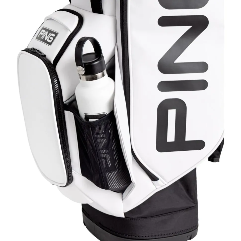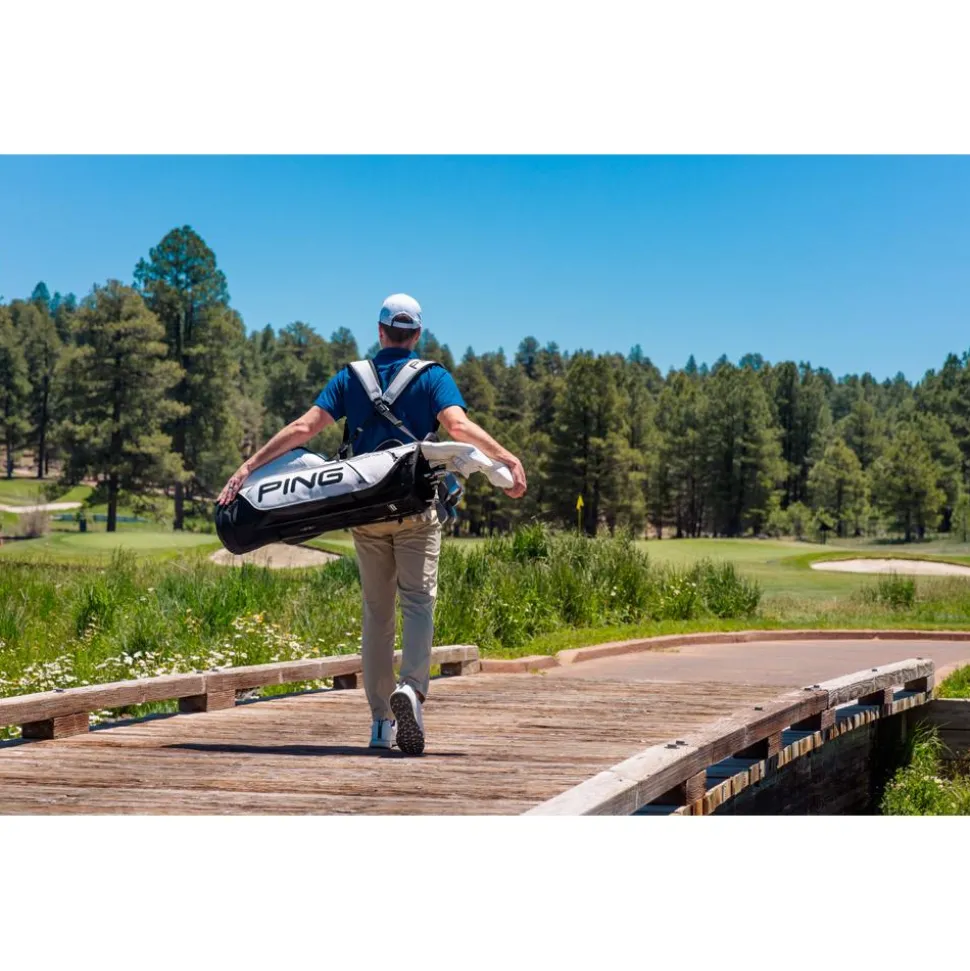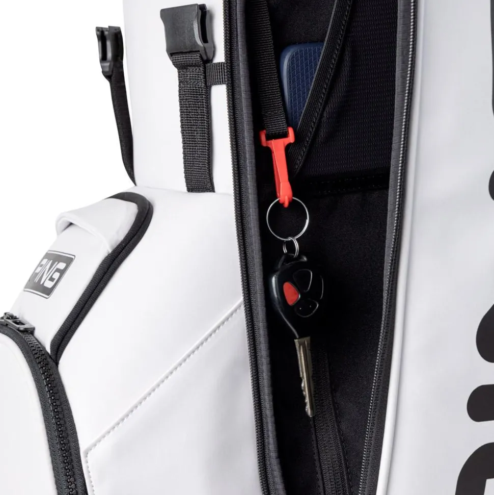 Le sac trépied Ping Hoofer Tour 244 White Black allie organisation optimale avec ses 5 compartiments et 9 poches, et confort grâce à ses bretelles ergonomiques, idéal pour un transport aisé sur les parcours.